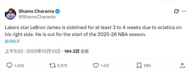 詹姆斯遭遇坐骨神經(jīng)痛!生涯首次缺席揭幕戰(zhàn) 專家稱可能休戰(zhàn)4-6周