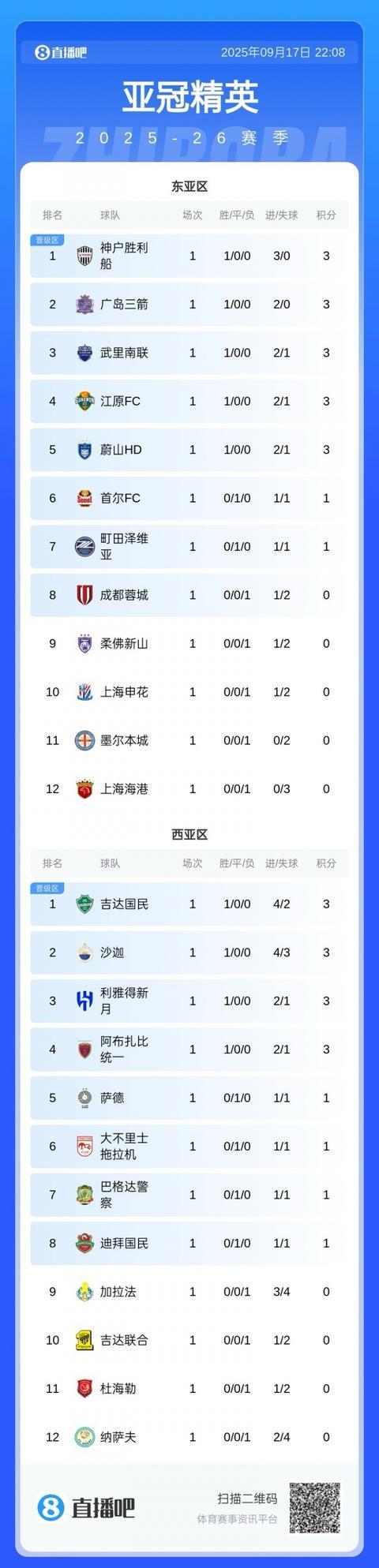 亞冠東亞區(qū)積分榜:中超3隊(duì)全敗均積0分,海港丟3球暫墊底